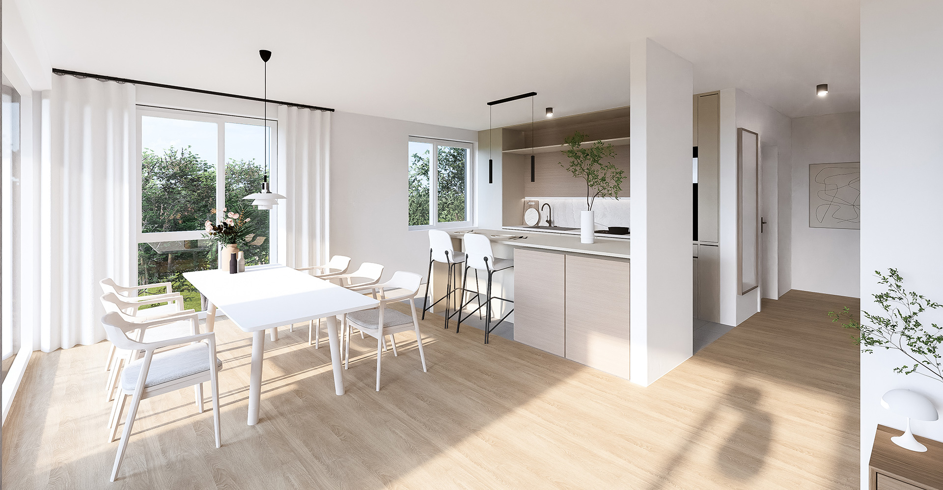 Die großzügige Wohneinheit befindet sich im Obergeschoss. Ausgestattet mit einer sonnigen Loggia, verfügt die offen geschnittene Wohnung über drei Zimmer auf einer Gesamtfläche von 103,78 m². Ausstattung wie Eiche-Echtholzparkett und eine tolle Wohnküche machen das Paket komplett.